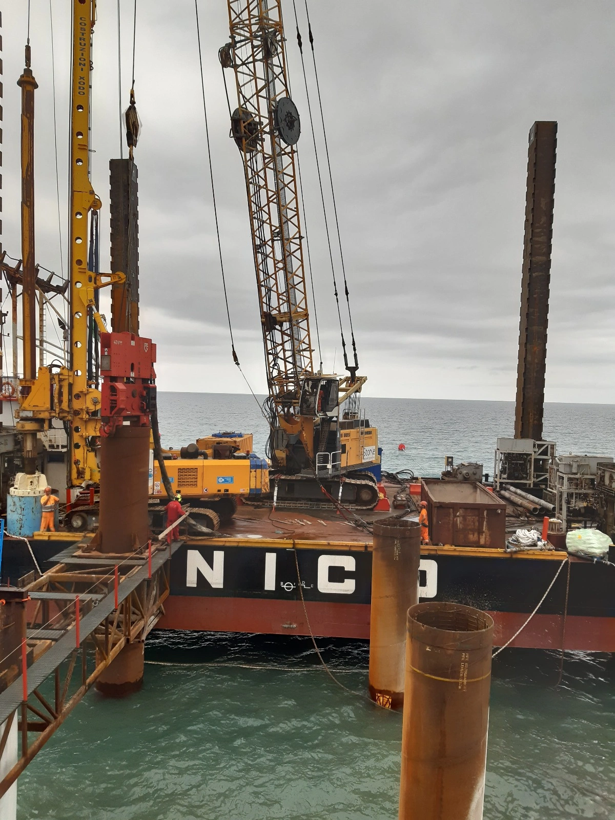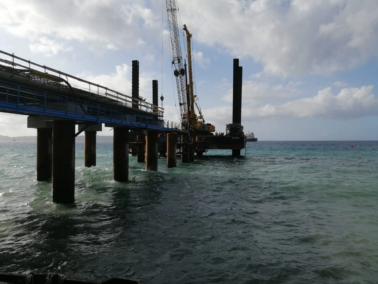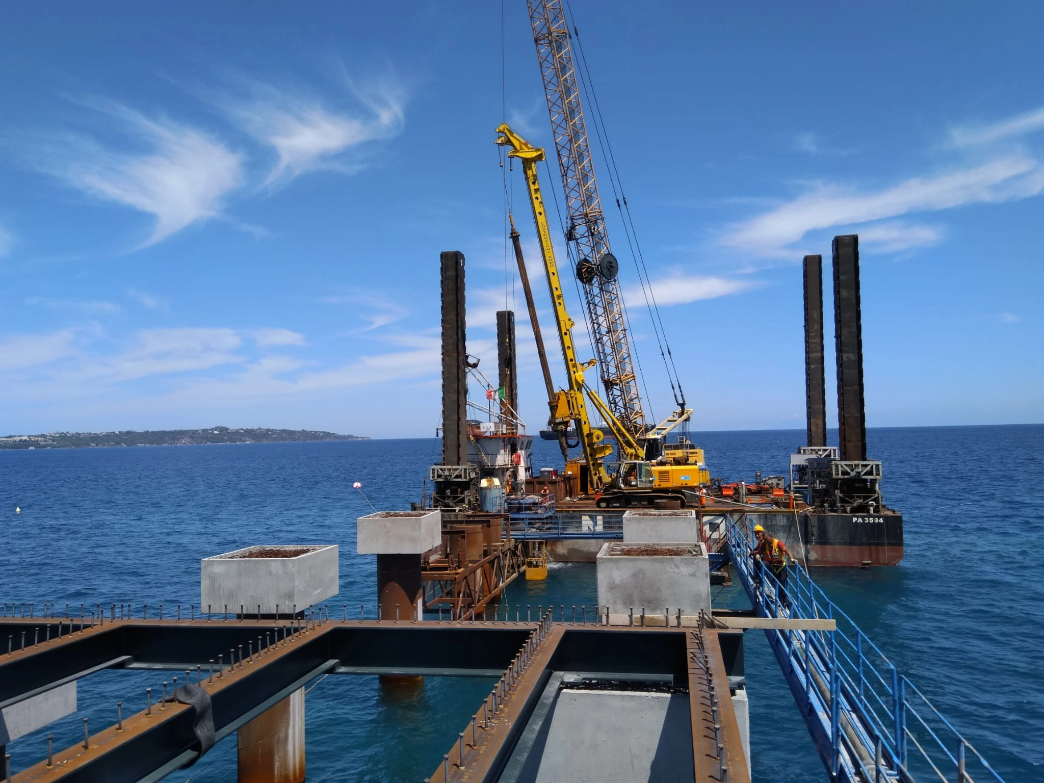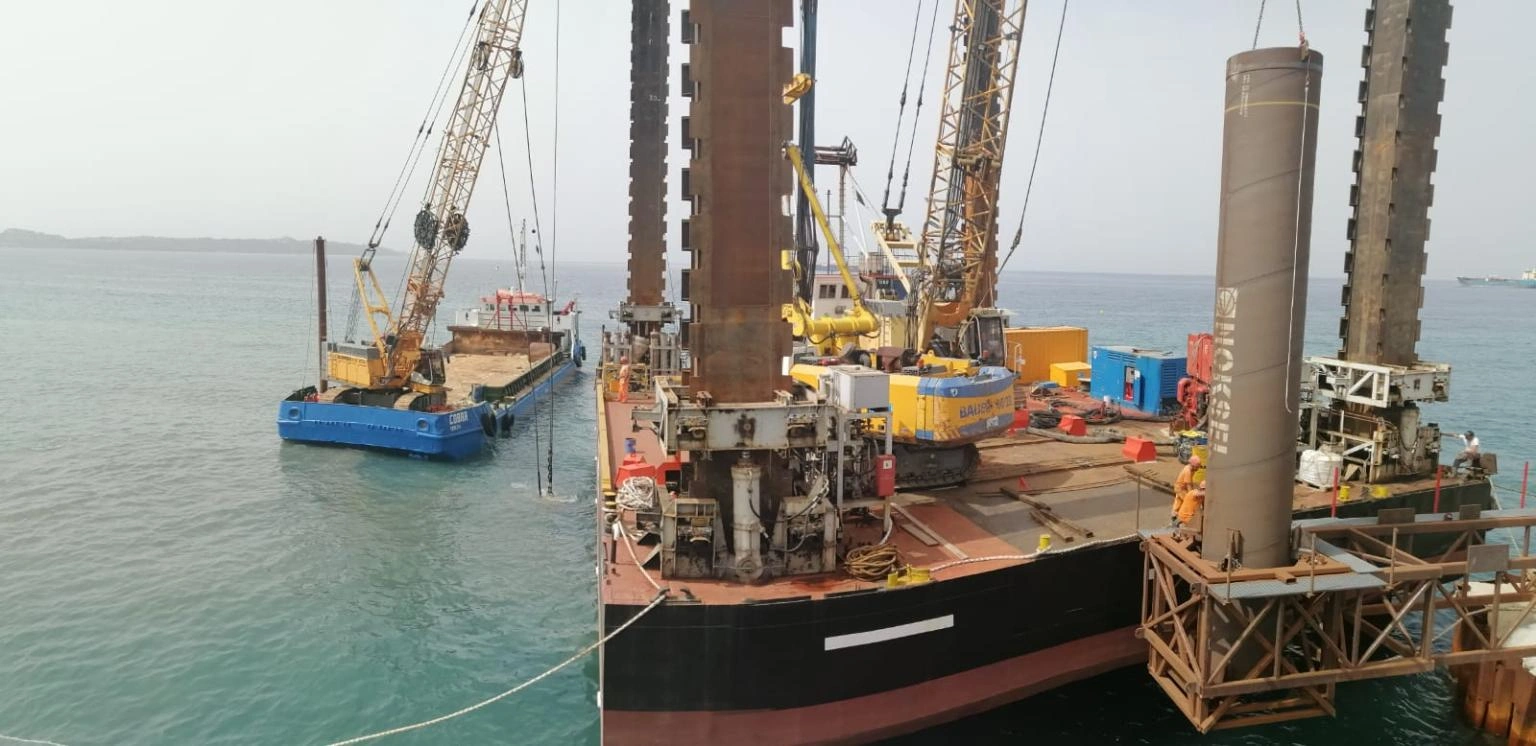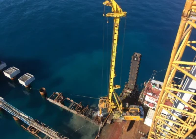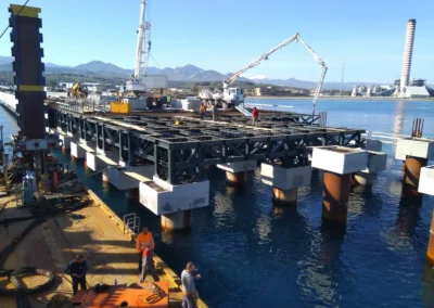 Realizzazione della Piattaforma di Attracco per uno sviluppo di 183.37 m e larghezza di 32.00 m, anch’essa a giorno. La piattaforma sarà fondata su pali disposti in 4 file ed aventi diametro φ 1500, nella prima metà lato sud, e φ 1800, nella seconda porzione lato nord ed interasse pari a 6 m in direzione longitudinale e 9 m in direzione trasversale. I pali avranno una profondità variabile tra i 49 e i 52 m dalla batimetrica -9.00 m alla batimetrica -25.00 m sotto il l.m.m. Sulla piattaforma di attracco saranno alloggiate n.9 bitte per ogni lato di accosto del tiro nominale di 150 t e n. 8 parabordi per ciascun lato di accosto. La piattaforma sarà suddivisa in 4 corpi strutturali adeguatamente giuntati.