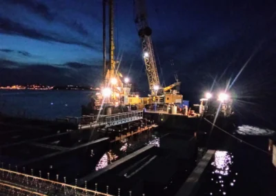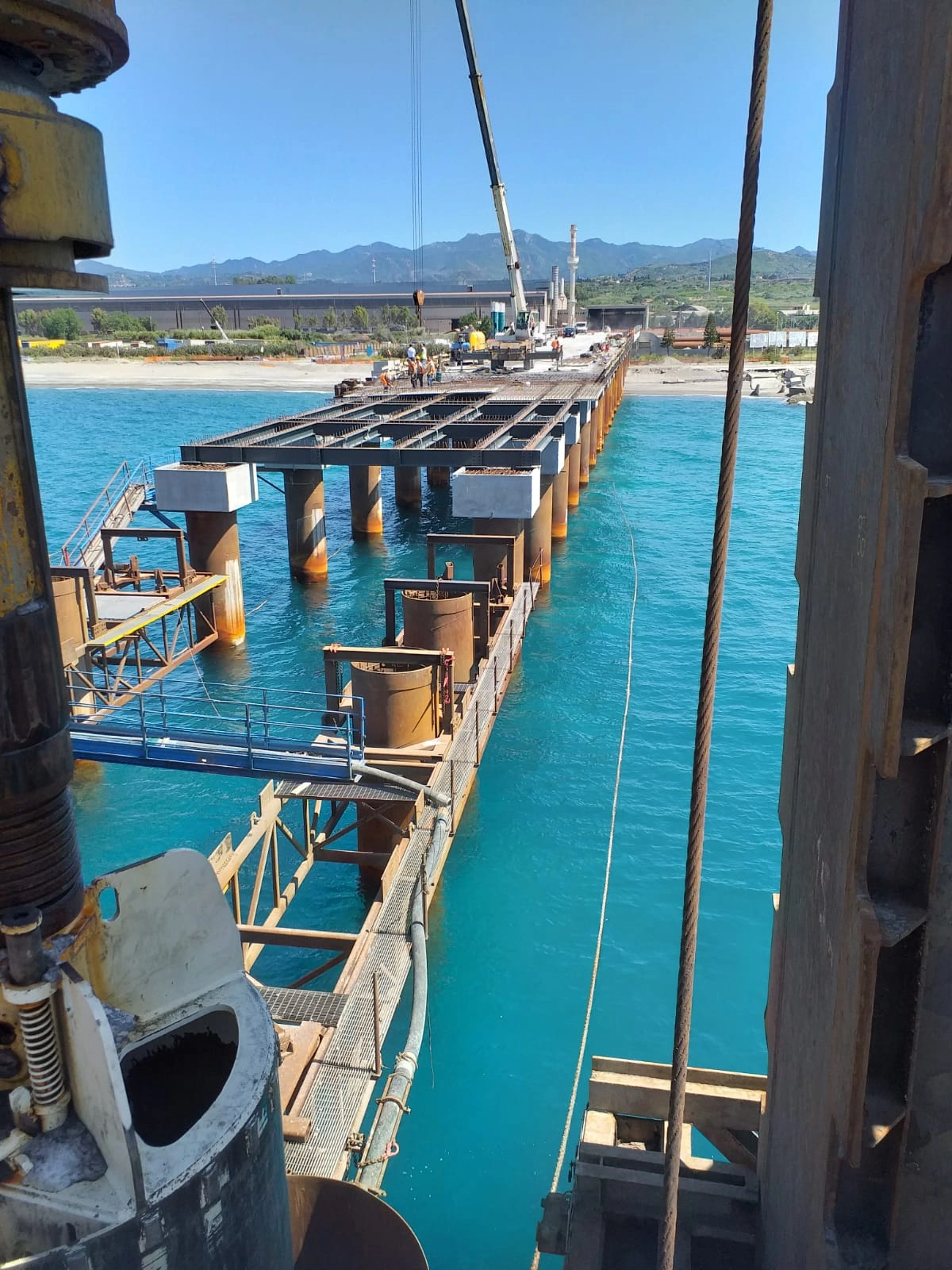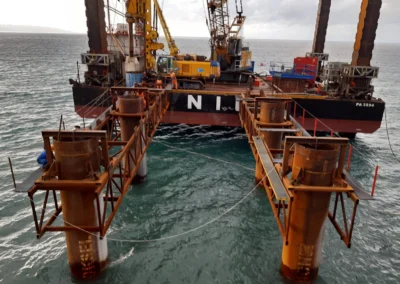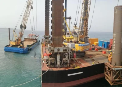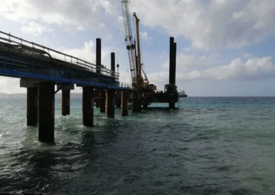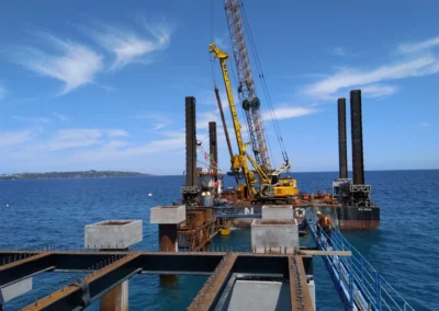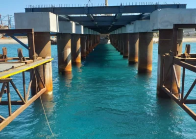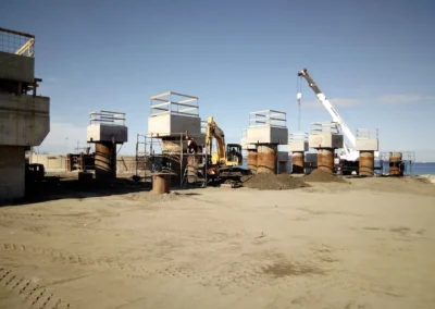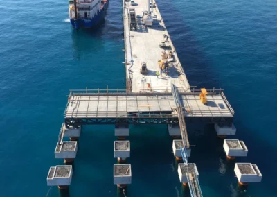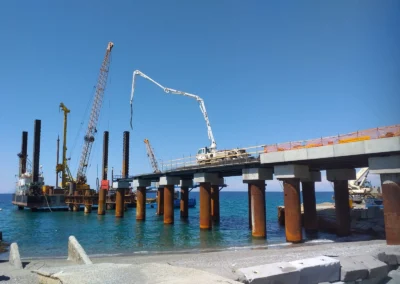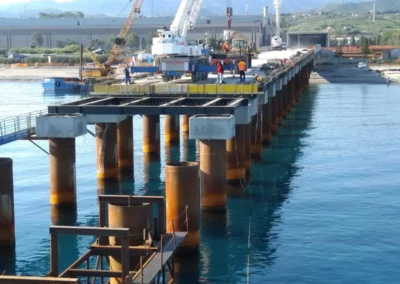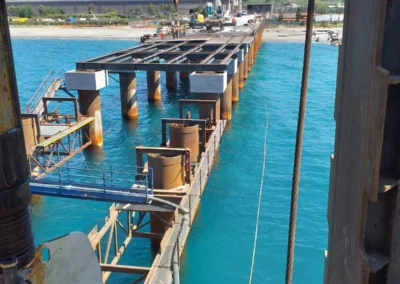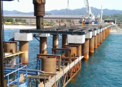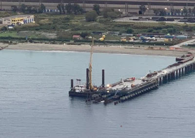 Realizzazione del tratto terminale, denominato Pontile di Ancoraggio, dello sviluppo di 30.00 m, sul quale troveranno collocazione le bitte di ancoraggio, sarà fondato su pali aventi diametro φ 1500, con profondità di 56 m e si estenderà su fondali variabili da -25.00 m alla -27.00 m. sotto il l.m.m.