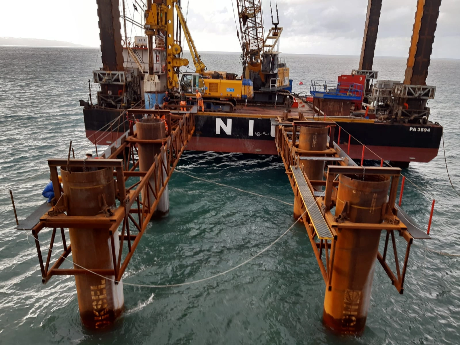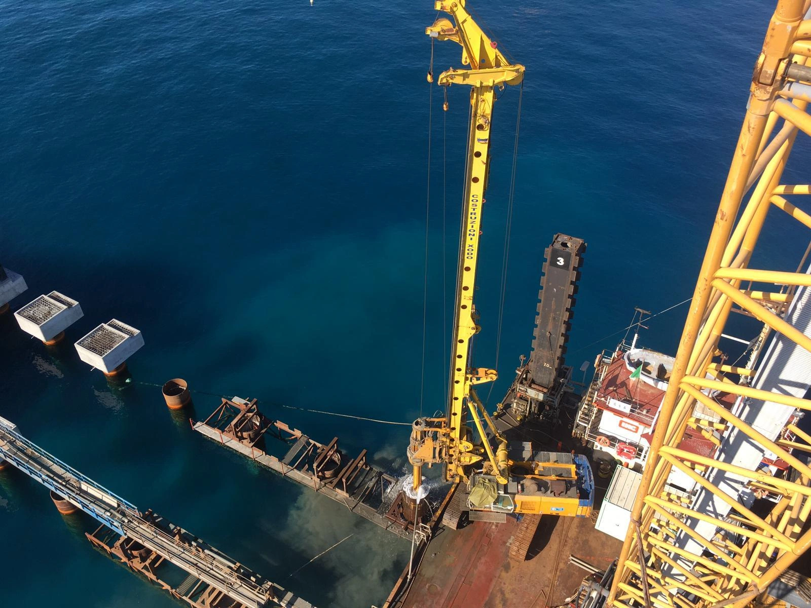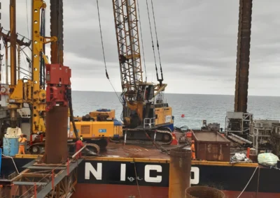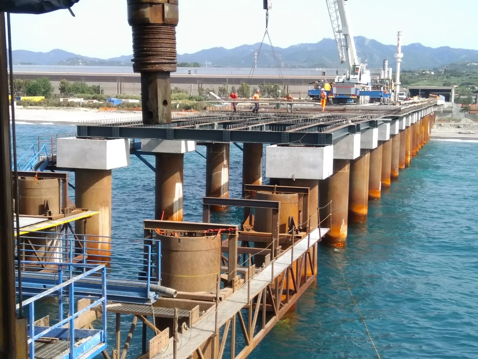 Realizzazione del tratto terminale, denominato Pontile di Ancoraggio, dello sviluppo di 30.00 m, sul quale troveranno collocazione le bitte di ancoraggio, sarà fondato su pali aventi diametro φ 1500, con profondità di 56 m e si estenderà su fondali variabili da -25.00 m alla -27.00 m. sotto il l.m.m.