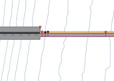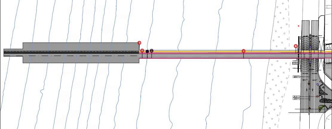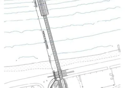 Attraverso il nuovo cavalcavia su Strada Industriale, il pontile sarà quindi raccordato a terra con la viabilità esistente tramite un rilevato avente altezza variabile da 5.50 m a 3.00 m. Tale viabilità di raccordo avrà una lunghezza di circa 250 m e sarà costituita da un’unica carreggiata (a due corsie, una per senso di marcia) della larghezza totale di 6.00 m.