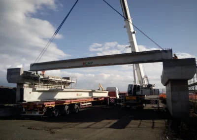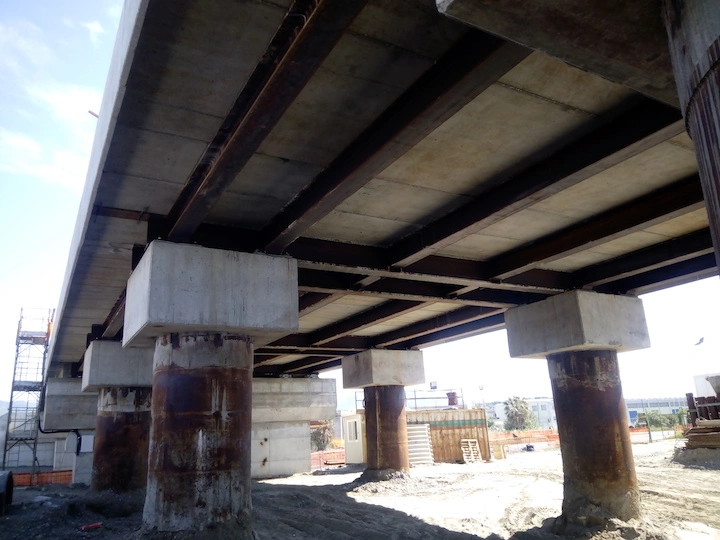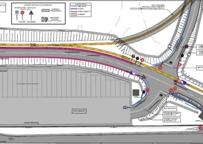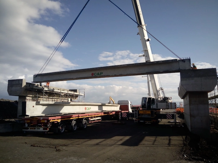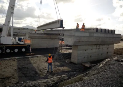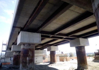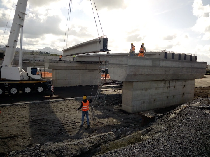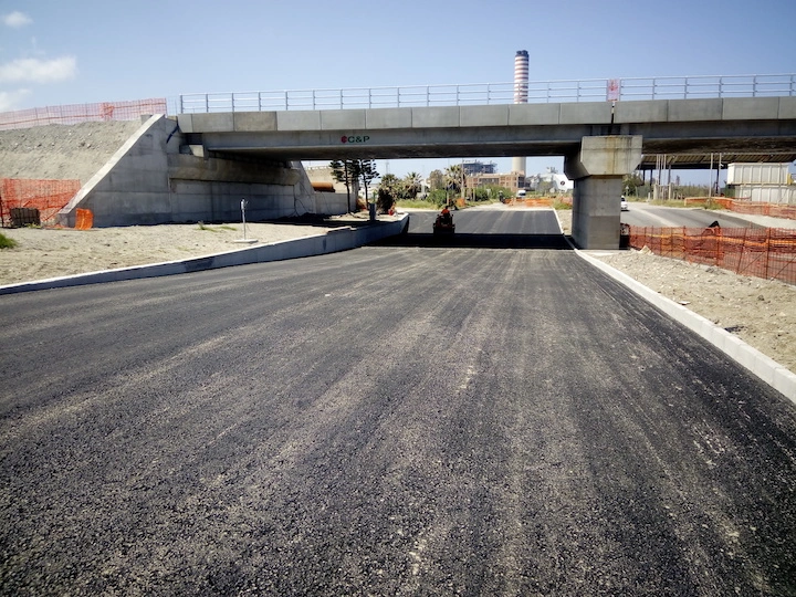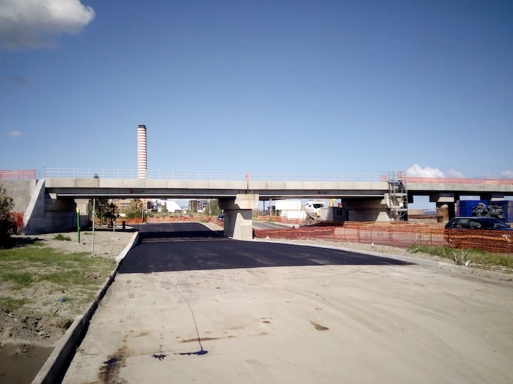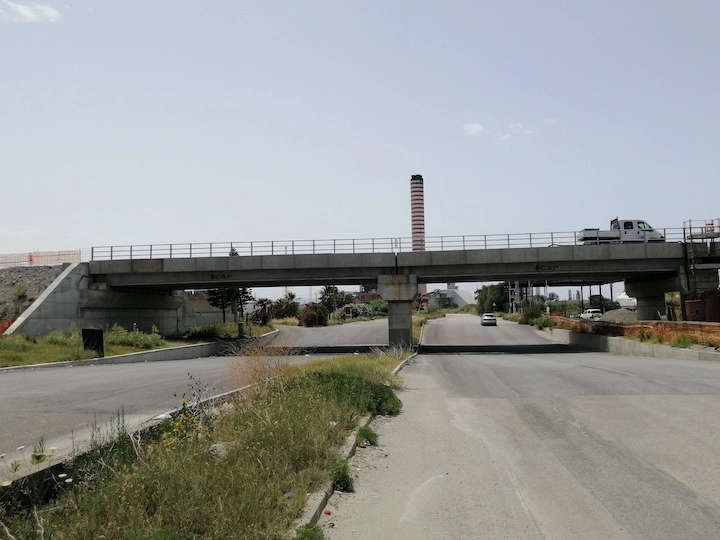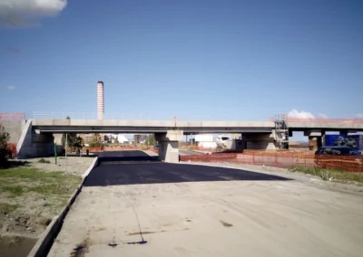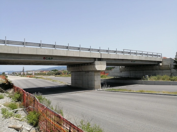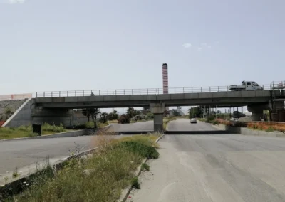 Demolizione e rifacimento del cavalcavia esistente che sarà costituito da n.2 campate della lunghezza di circa 21.00 m cadauna, poggiato su due spalle in c.a. ai lati e su una pila in c.a. al centro, fondati su piastra in c.a. di altezza h=200 cm. Gli impalcati, di larghezza complessiva pari a 13 m, saranno realizzati con n.10 travi in c.a.p a doppio T aventi altezza h=110 cm. E’ previsto inoltre l’adeguamento della sede stradale della Strada Industriale in corrispondenza del cavalcavia, mediante realizzazione di un sottopasso.